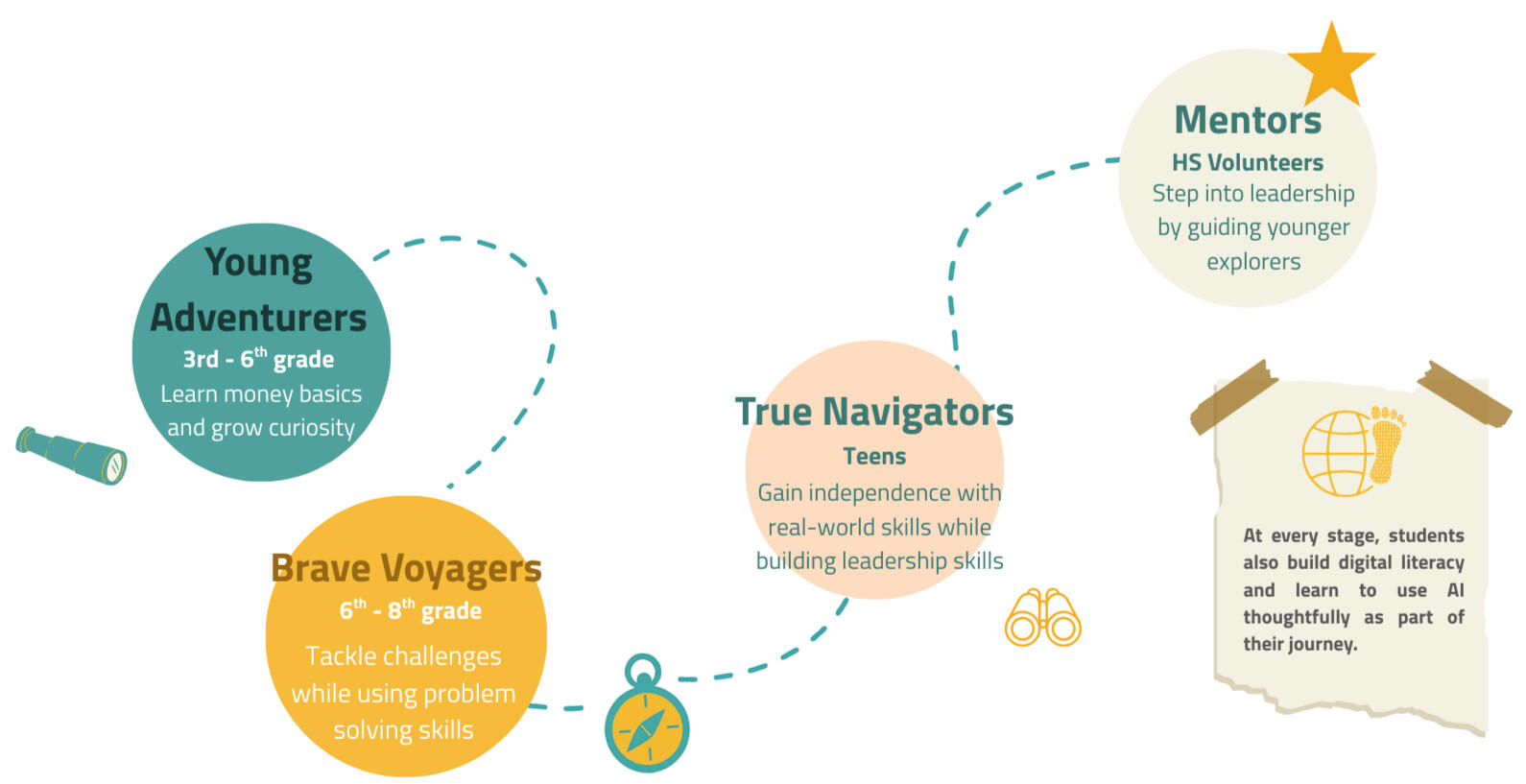 Finance Explorers is where curiosity meets confidence. Through hands-on adventures, students progress from Young Adventurers to True Navigators, building financial confidence one step at a time, and gaining life skills like teamwork, leadership, and age-appropriate digital and AI literacy.